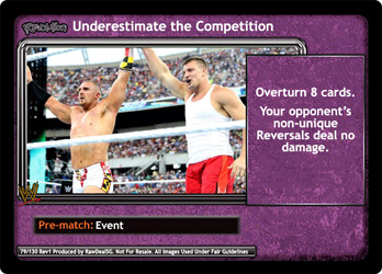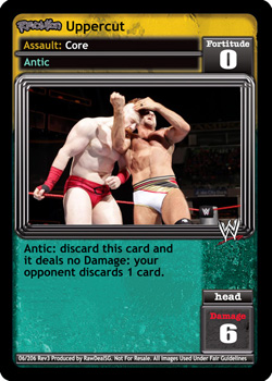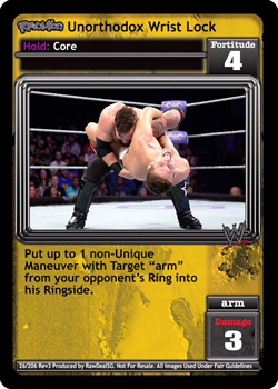 When you do not have a Corner in your Ring: -10F. Search your Arsenal for 1 Superstar-specific maneuver, reveal it, put it in your hand, and shuffle. When it is the next card you play this turn, it is -8F, and if that maneuver is not successfully played, put this card from your Ring into your hand.