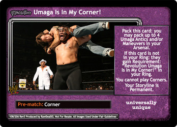 Pack this card: you may pack up to 4 Umaga Antics and/or Maneuvers in your Arsenal. If this card is not in your Ring: they gain Requirement: 'Revolution Umaga Is In My Corner!' in your Ring. You cannot play Corners. Your Storyline is Permanent.
