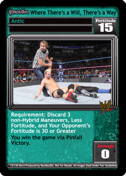 Requirement: Discard 3 non-Hybrid Maneuvers, Less Fortitude, and Your Opponent's Fortitude is 30 or Greater You win the game via Pinfall Victory.