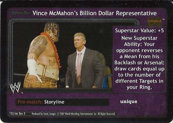 Superstar Value: +5 New Superstar Ability: Your opponent reverses a Mean from his Backlash or Arsenal: draw cards equal up to the number of different Targets in your Ring.