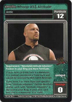 Requirement: 'Revolution Attitude Adjusters' Faction in your Ring and More Fortitude. If your next card this turn is a Maneuver, it is instead considered a Trademark and cannot be reversed by Mid-match Reversals. If you have 3 or more Superstar-specifics from 'Attitude Adjusters' Faction Members and/or cards with 'Attitude Adjusters' in the text in your Ring, if your next card this turn is a Maneuver, it is +10D.