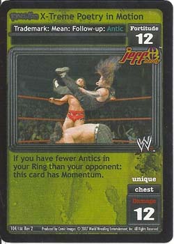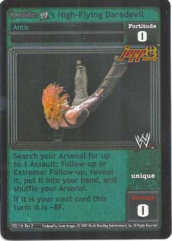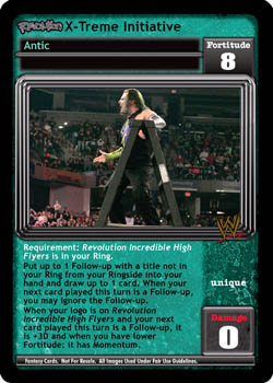 Requirement: Revolution Incredible High Flyers is in your Ring. Put up to 1 Follow-up with a title not in your Ring from your Ringside into your hand and draw up to 1 card. When your next card played this turn is a Follow-up, you may ignore the Follow-up. When your logo is on Revolution Incredible High Flyers and your next card played this turn is a Follow-up, it is +3D and when you have lower Fortitude: it has Momentum.