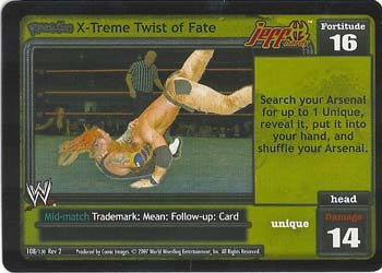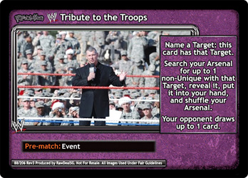 Before the Draw Segment of the first turn of the game, put up to 2 cards from your hand on the bottom of your Arsenal and draw the same number of cards; when you have higher Superstar Value, double that number. Ignore your opponent's card effects that would allow him to start the game. Your Superstar Value is +5.