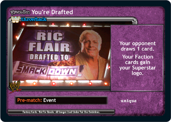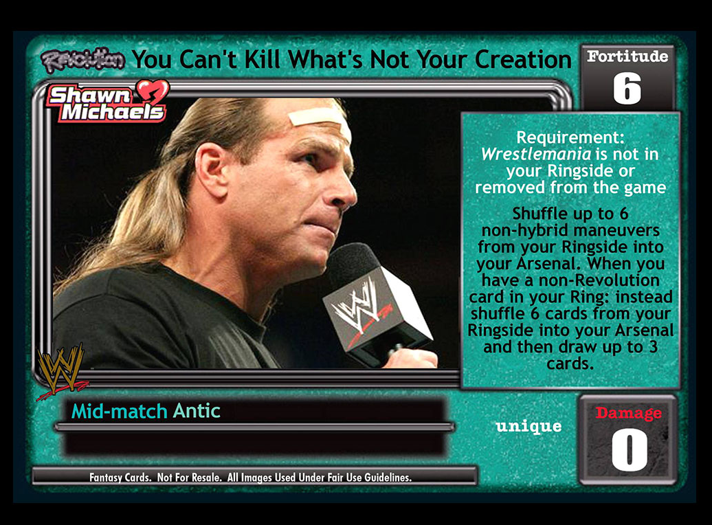 Requirement: Wrestlemania is not in your Ringside or removed from the game Shuffle up to 6 non-hybrid maneuvers from your Ringside into your Arsenal. When you have a non-Revolution card in your Ring: instead shuffle 6 cards from your Ringside into your Arsenal and then draw up to 3 cards.