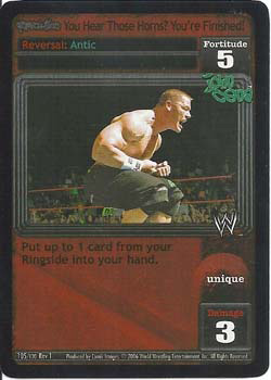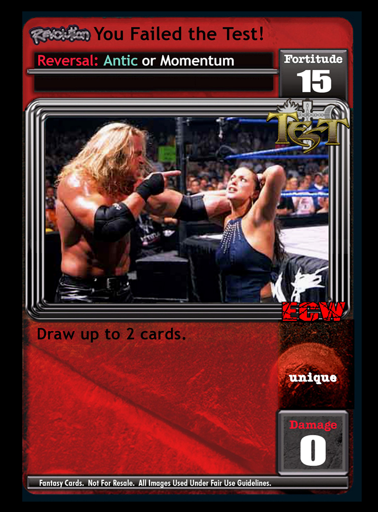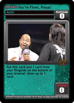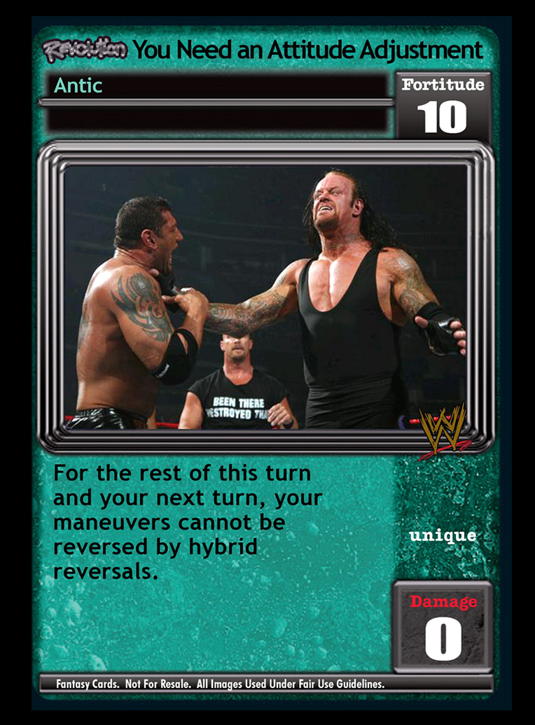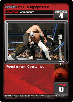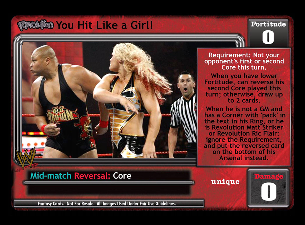 Requirement: Not your opponent's first or second Core this turn. When you have lower Fortitude, can reverse his second Core played this turn; otherwise, draw up to 2 cards. When he is not a GM and has a Corner with 'pack' in the text in his Ring, or he is Revolution Matt Striker or Revolution Ric Flair: ignore the Requirement, and put the reversed card on the bottom of his Arsenal instead.