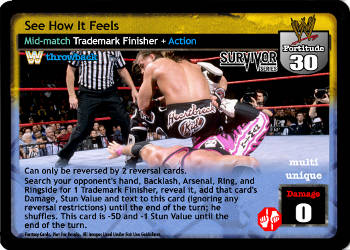 Can only be reversed by 2 reversal cards. Search your opponent's hand, Backlash, Arsenal, Ring and Ringside for 1 Trademark Finisher, reveal it, add that card's Damage, Stun Value and text to this card, ignoring any reversal restrictions, until the end of the turn; he shuffles his Arsenal. This card is -5D and -1 Stun Value until the end of the turn.