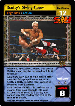 When you are Scotty 2 Hotty, this card is Multi and can only be reversed by 2 D: 0 reversals. As a maneuver, can only be played after a successfully played maneuver or a Scotty 2 Hotty-specific card; cannot be reversed from Backlash. As an action, shuffle this card and up to 2 cards from your Ringside into your Arsenal and draw up to 2 cards; you cannot play this card for the rest of the turn as an action.