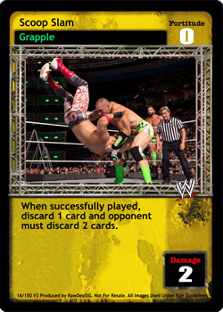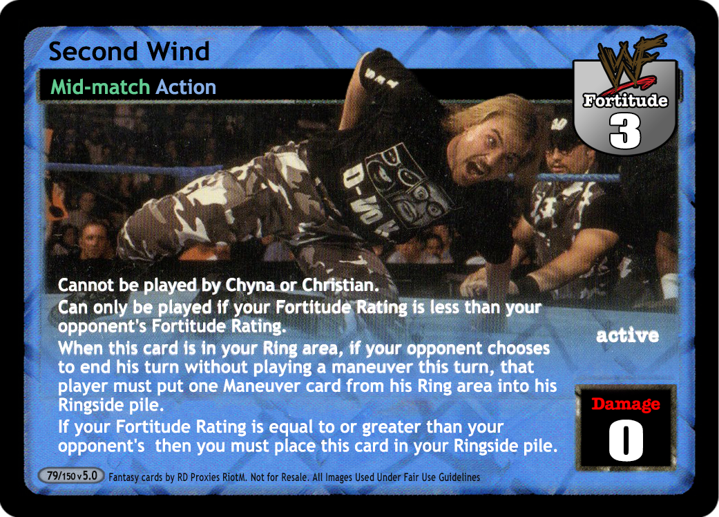 Cannot be played by Chyna or Christian. Can only be played if your Fortitude Rating is less than your opponent's Fortitude Rating. When this card is in your Ring area, if your opponent chooses to end his turn without playing a maneuver this turn, that player must put one maneuver card in his Ring area into his Ringside pile. If your Fortitude Rating is equal to or greater than your opponent's then you must place this card in your Ringside pile.
