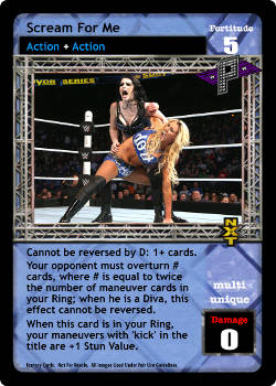 Cannot be reversed by D: 1+ cards. Your opponent must overturn # cards, where # is equal to twice the number of maneuver cards in your Ring; when he is a Diva, this effect cannot be reversed. When this card is in your Ring, your maneuvers with 'kick' in the title are +1 Stun Value.