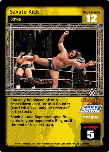 Can only be played after a Smackdown card, or as a Counter (card with can only be reversed in the text). Blank all non-Superstar-specific cards in your opponent's Ring until the end of his next turn.