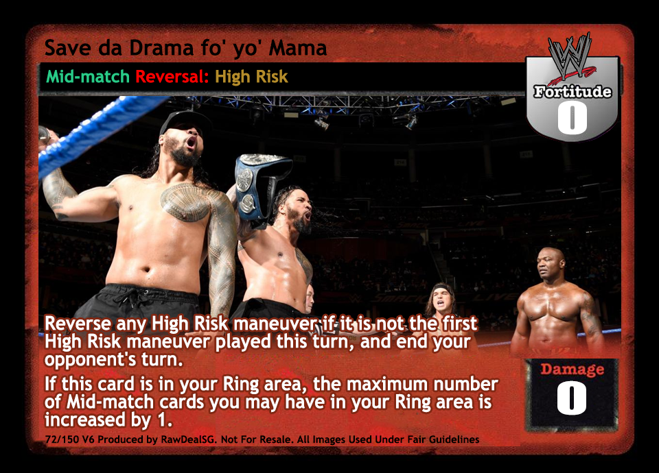 Reverse any High Risk maneuver if it is not the first High Risk maneuver played this turn, and end your opponent's turn. If this card is in your Ring area, the maximum number of Mid-match cards you may have in your Ring area is increased by 1.