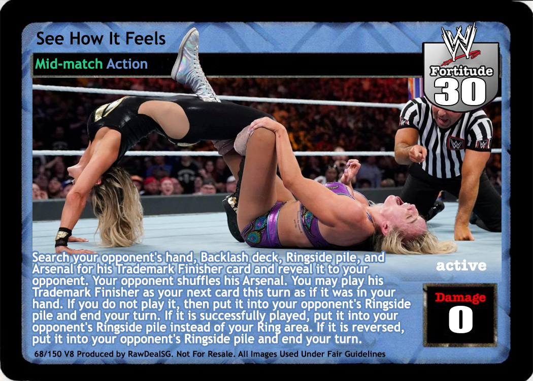 Search your opponent's hand, Backlash deck, Ringside pile, and Arsenal for his Trademark Finisher card and reveal it to your opponent. Your opponent shuffles his Arsenal. You may play his Trademark Finisher as your next card this turn as if it was in your hand. If you do not play it, then put it into your opponent's Ringside pile and end your turn. If it is successfully played, put it into your opponent's Ringside pile instead of your Ring area. If it is reversed, put it into your opponent's Ringside pile and end your turn.