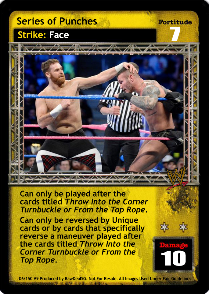 Can only be played after the cards titled Throw Into the Corner Turnbuckle or From the Top Rope. Can only be reversed by Unique cards or by cards that specifically reverse a maneuver played after the cards titled Throw Into the Corner Turnbuckle or From the Top Rope.