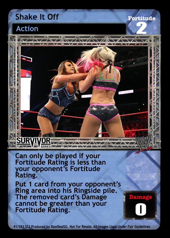 Can only be played if your Fortitude Rating is less than your opponent's Fortitude Rating. Put 1 card from your opponent's Ring area into his Ringside pile. The removed card's Damage cannot be greater than your Fortitude Rating.