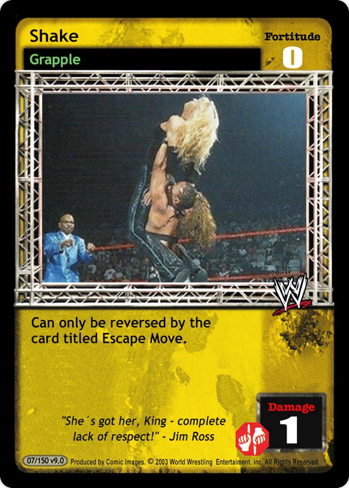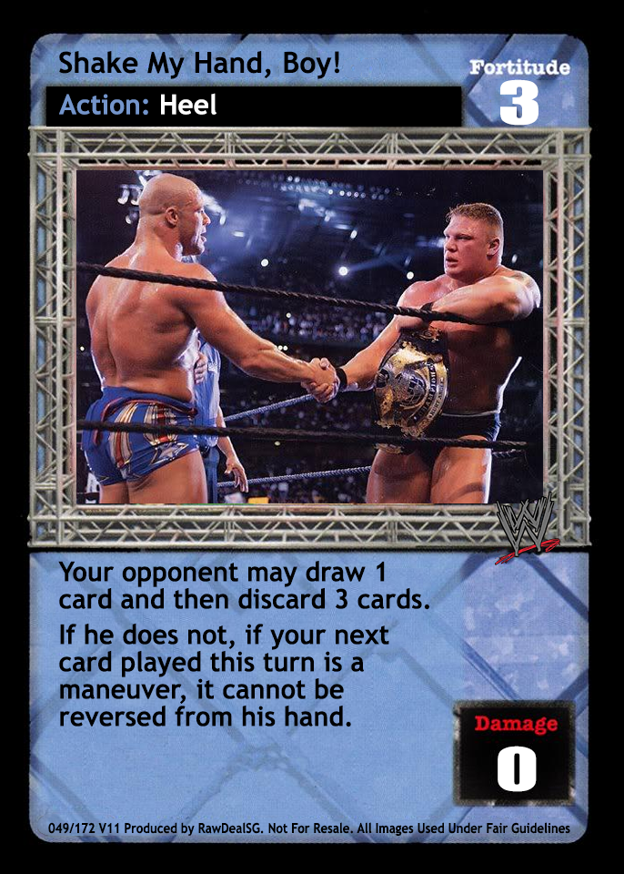When your Fortitude Rating is 30+, this card is a Trademark Finisher instead of a Grapple. Your opponent chooses 2 cards in his hand, and puts the cards not chosen on the top of his Arsenal. When this card is in your Ring, he cannot move his cards from Ringside or removed from the game to his Arsenal.