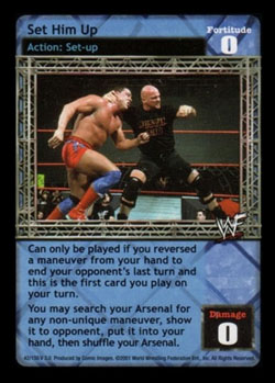 The damage of this card cannot be modified. Can only be played after Throw Into The Corner Turnbuckle, or as a Counter (Hand). Cannot be reversed from hand when played after a Set-up. When reversed from Arsenal, draw #- cards, where # = 10 - the applied damage.