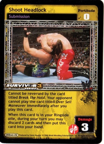 Cannot be reversed by the card titled Break the Hold. Your opponent cannot play the card titled Over Sell Maneuver immediately after you play this card. During your turn, if this card is in your Ringside pile, you may discard 2 cards to put this card into your hand.