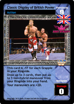 This card is -1F for each Grapple in your Ringside. Draw up to 3 cards, then put up to 1 non-hybrid maneuver from your Ringside into your hand. Your maneuvers are +2D.