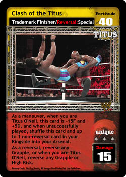 As a maneuver, when you are Titus O'Neil, this card is -15F and +5D, and when unsuccessfully played, shuffle this card and 1 non-reversal card in your Ringside into your Arsenal. As a reversal, reverse any Grapple, or when you are Titus O'Neil, reverse any Grapple or High Risk.