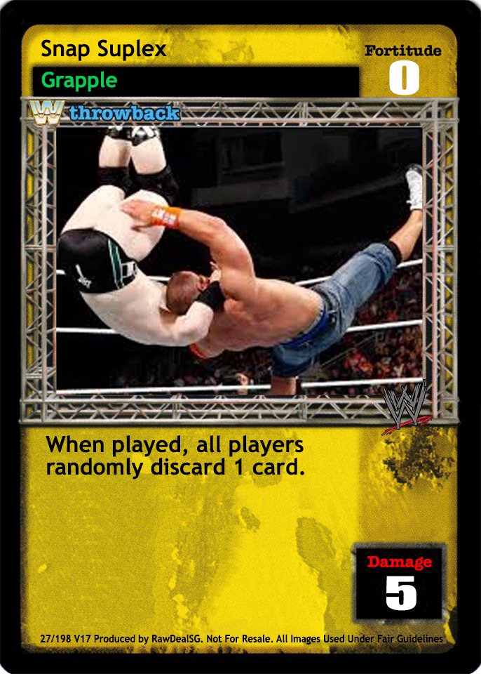 Cannot be reversed by the cards titled Elbow to the Face or Clumsy Opponent. When successfully played, if your next card played this turn has the word "suplex" in the title, it cannot be reversed from your opponent's Backlash deck.