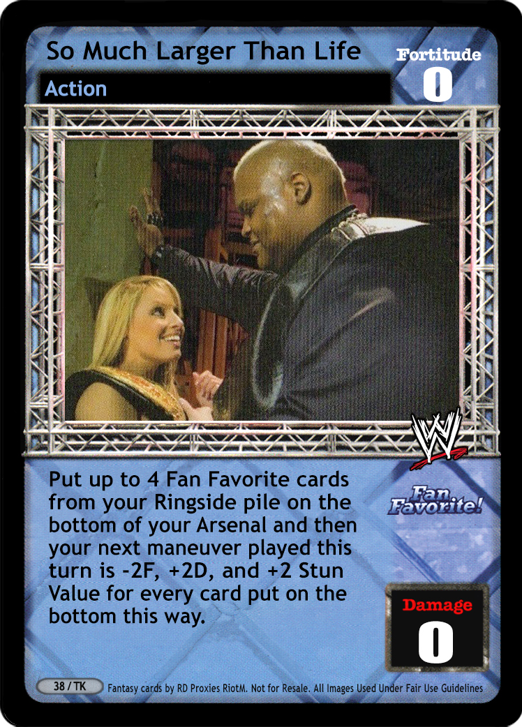 Put up to 4 Fan Favorite cards from your Ringside pile on the bottom of your Arsenal and then your next maneuver played this turn is -2F, +2D, and +2 Stun Value for every card put on the bottom this way.