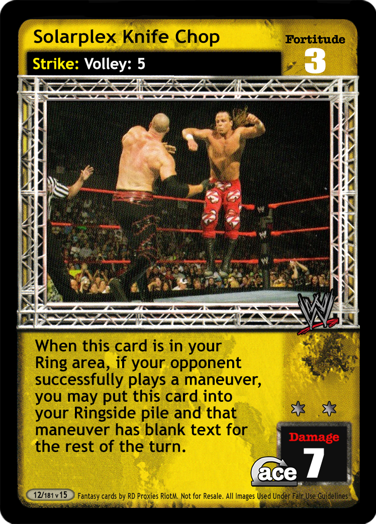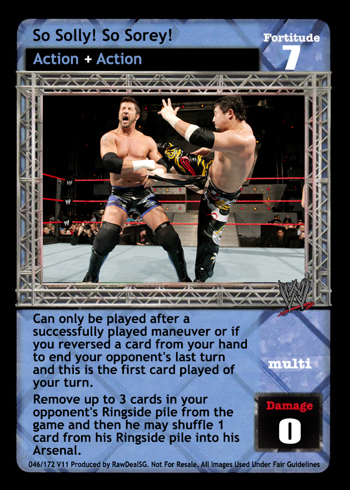 Can only be played after a successfully played maneuver or if you reversed a card from your hand to end your opponent's last turn and this is the first card played of your turn. Remove up to 3 cards in your opponent's Ringside pile from the game and then he may shuffle 1 card from his Ringside pile into his Arsenal.