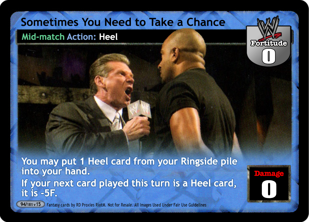 You may put 1 Heel card from your Ringside pile into your hand. If your next card played this turn is a Heel card, it is -5F.
