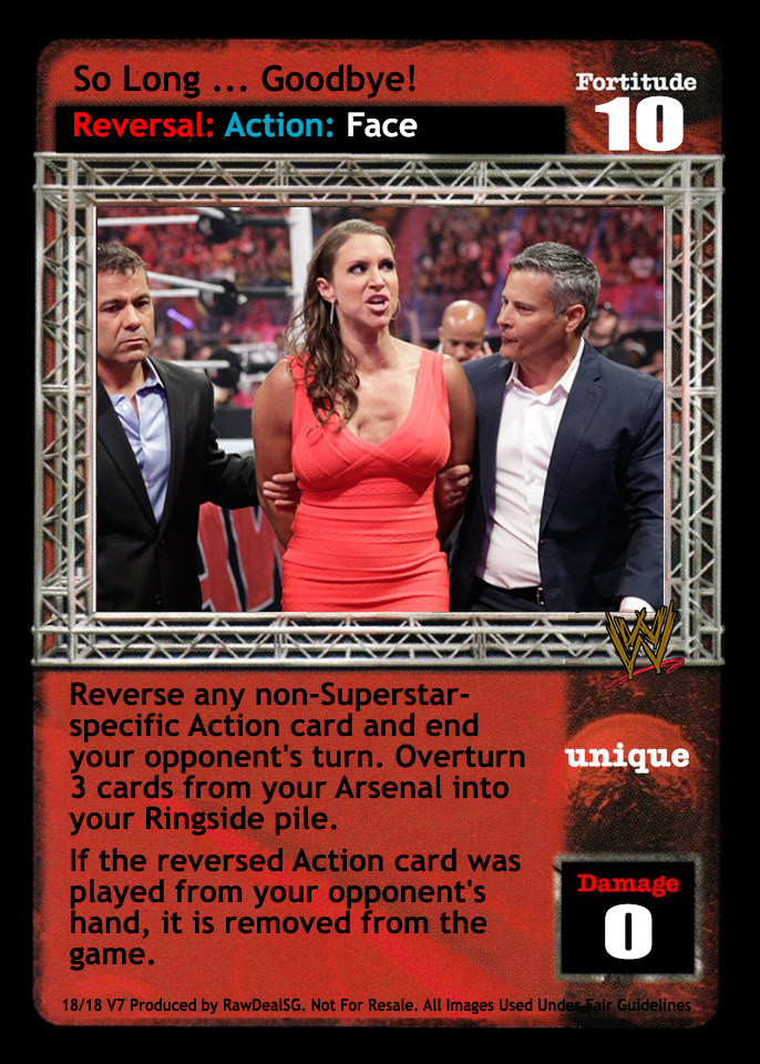 Reverse any non-Superstar-specific Action card and end your opponent's turn. Overturn 3 cards from your Arsenal into your Ringside pile. If the reversed Action card was played from your opponent's hand, it is removed from the game.