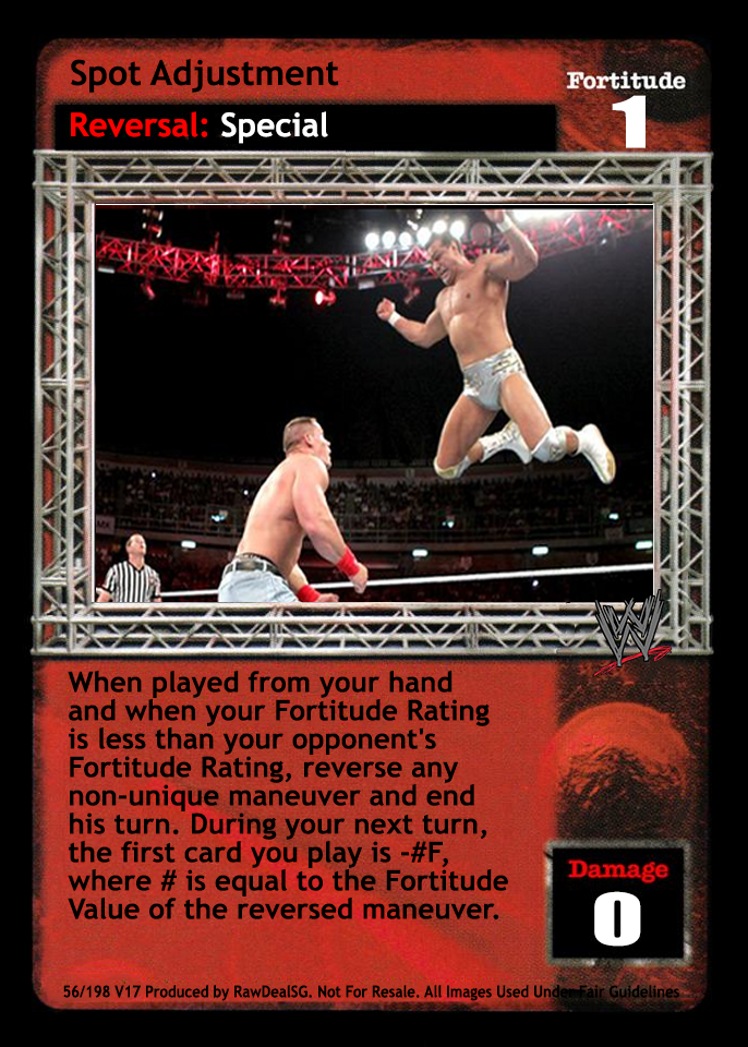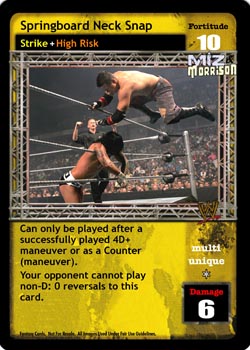 You may play this card if your Superstar card indicates you may not play any title belt except the Tag Team Title Belts. As a maneuver, can only be played after a 5D or greater maneuver or the card titled Throw Into the Corner Turnbuckle. As a reversal, can reverse the cards titled Superplex or From the Top Rope. When successfully played, opponent must choose 2 cards from his hand and place them on top of his Arsenal. This card is -7F if played by the Dudley Boyz or Edge & Christian.