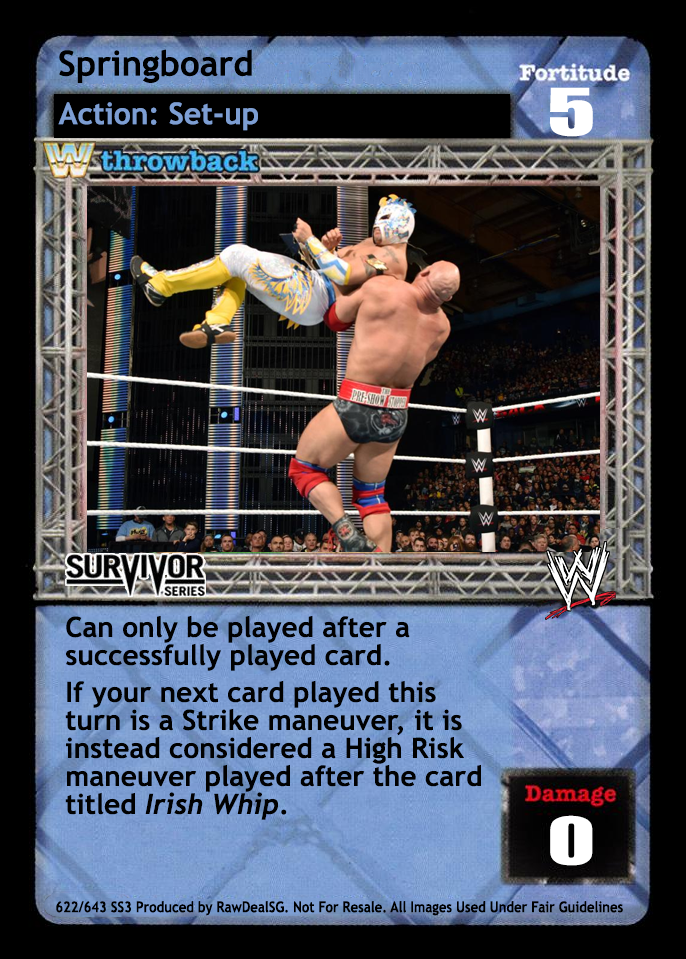 Can only be played after a successfully played card. If your next card played this turn is a Strike maneuver, it is instead considered a High Risk maneuver played after the card titled Irish Whip.