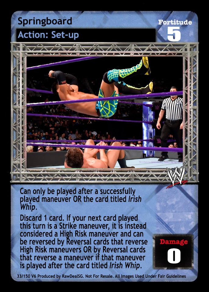 Can only be played after a successfully played maneuver OR the card titled Irish Whip. Discard 1 card. If your next card played this turn is a Strike maneuver, it is instead considered a High Risk maneuver, and can be reversed by Reversal cards that specifically reverse a maneuver if that maneuver is played after the card titled Irish Whip.