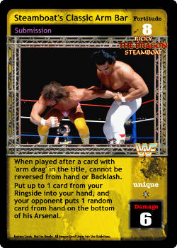 When played after a card with 'arm drag' in the title, cannot be reversed from hand or Backlash. Put up to 1 card from your Ringside into your hand, and your opponent puts 1 random card from hand on the bottom of his Arsenal.