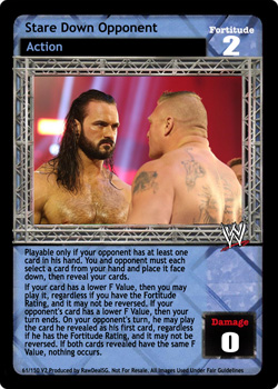 Playable only if your opponent has at least one card in his hand. You and opponent must each select a card from your hand and place it face down, then reveal your cards. If your card has a lower F Value, then you may play it, regardless if you have the Fortitude Rating, and it may not be reversed. If your opponent's card has a lower F Value, then your turn ends. On your opponent's turn, he may play the card he revealed as his first card, regardless if he has the Fortitude Rating, and it may not be reversed. If both cards revealed have the same F Value, nothing occurs.