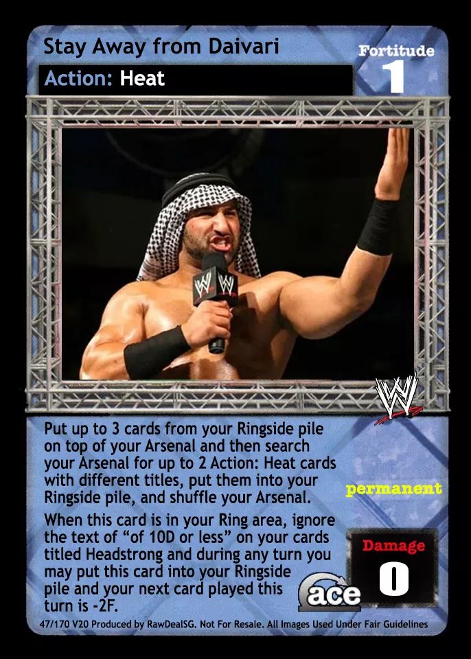 Put up to 3 cards from your Ringside pile on top of your Arsenal and then search your Arsenal for up to 2 Action: Heat cards with different titles, put them into your Ringside pile, and shuffle your Arsenal. When this card is in your Ring area, ignore the text of "of 10D or less" on your cards titled Headstrong and during any turn you may put this card into your Ringside pile and your next card played this turn is -2F.