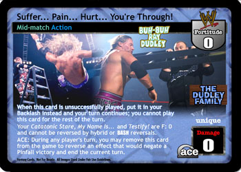 When this card is unsuccessfully played, put it in your Backlash instead, and your turn continues; you may not play this card for the rest of the turn. Your Catatonic Stare, My Name Is... and Testify! are F: 0 and cannot be reversed by hybrid or BASH reversals. ACE: During any player's turn, you may remove this card from the game to reverse an effect that would negate a Pinfall victory and end the current turn.