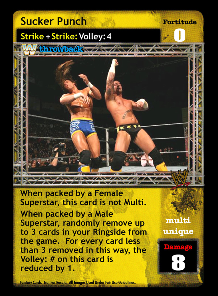 When packed by a Female Superstar, this card is not Multi. When played by a Male Superstar, randomly remove up to 3 cards in your Ringside from the game. For every card less than 3 removed in this way, the Volley: # on this card is reduced by 1.