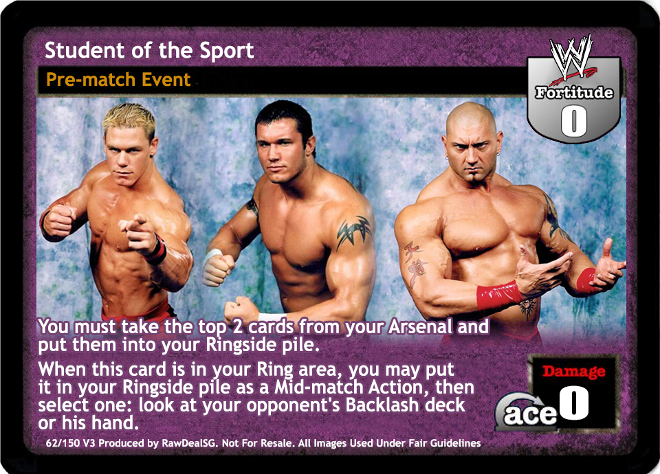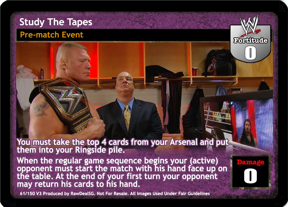 You must take the top 4 cards from your Arsenal and put them into your Ringside pile. When the regular game sequence begins your (active) opponent must start the match with his hand face up on the table. At the end of your first turn your opponent may return his cards to his hand.