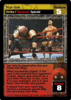Can only be played after the card titled Irish Whip. When successfully played, if this card is not reversed from opponent's Arsenal, search your Arsenal for a card titled Hung Out to Dry, show it to your opponent, put it in your hand, then shuffle your Arsenal. If played from your hand, may reverse a maneuver played after the card titled Irish Whip.