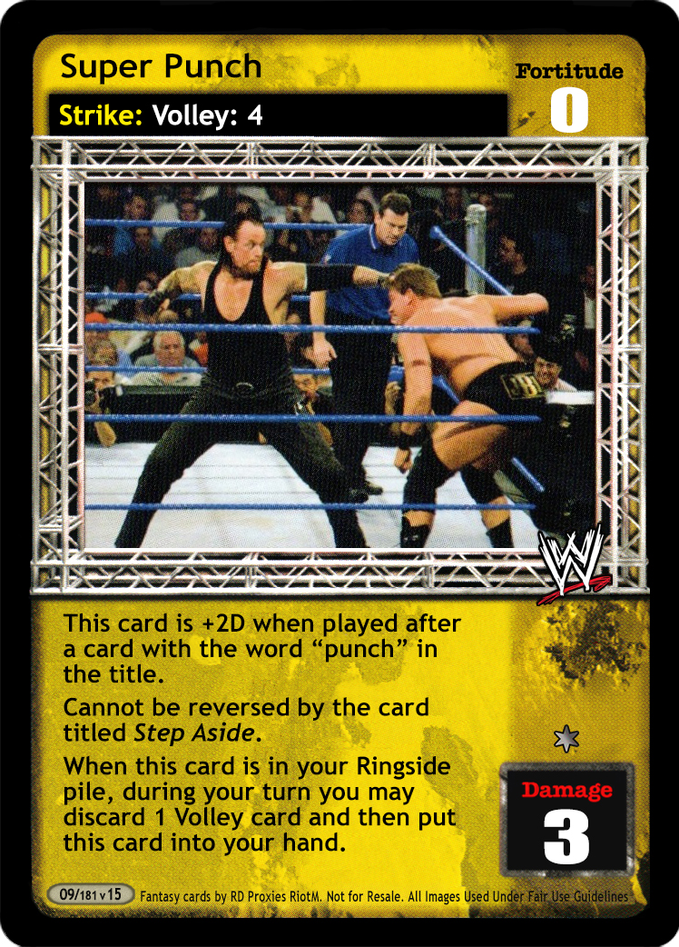 This card is +2D when played after a card with the word "punch" in the title. Cannot be reversed by the card titled Step Aside. When this card is in your Ringside pile, during your turn you may discard 1 Volley card and then put this card into your hand.