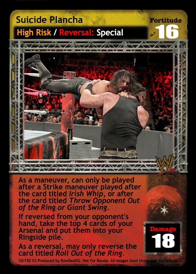 As a maneuver, can only be played after a Strike maneuver played after the card titled Irish Whip, or after the card titled Throw Opponent Out of the Ring or Giant Swing. If reversed from your opponent's hand, take the top 4 cards of your Arsenal and put them into your Ringside pile. As a reversal, may only reverse the card titled Roll Out of the Ring.