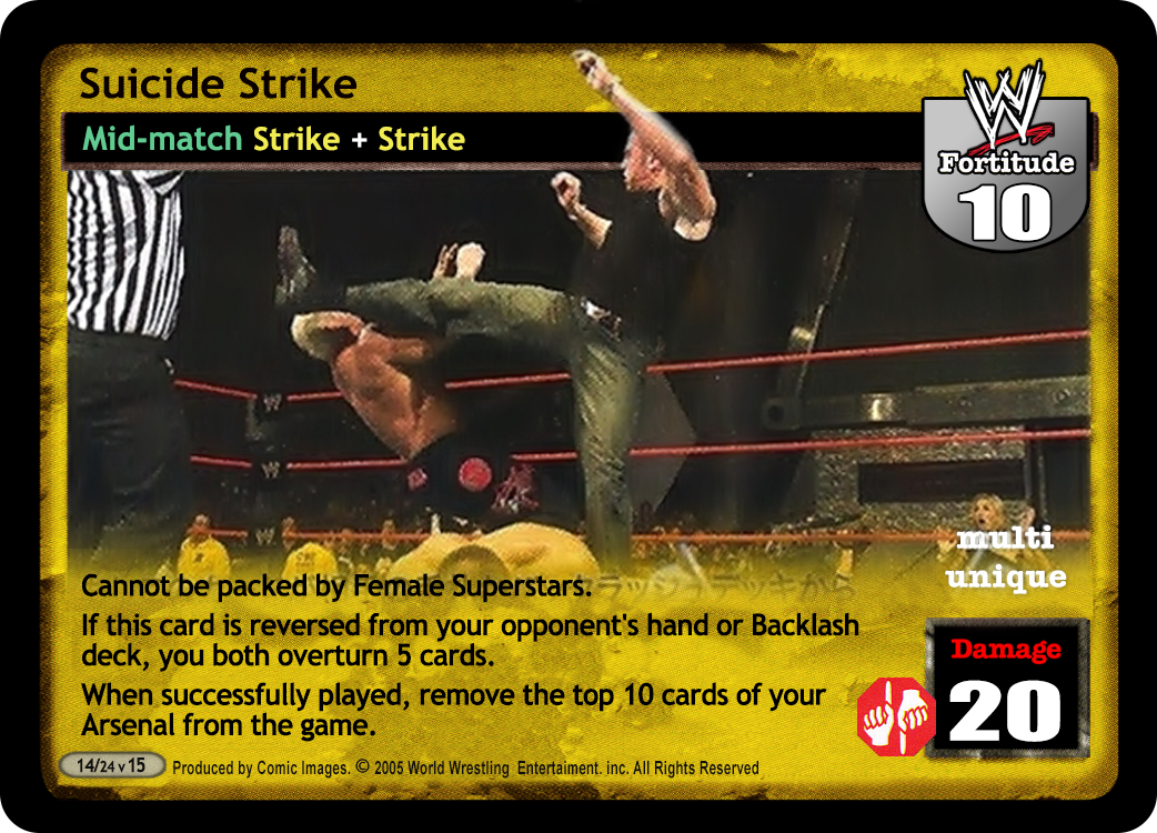 Cannot be packed by Female Superstars. If this card is reversed from your opponent's hand or Backlash deck, you both overturn 5 cards. When successfully played, remove the top 10 cards of your Arsenal from the game.
