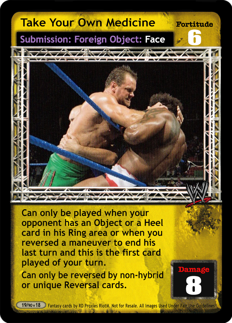 Can only be played when your opponent has an Object or a Heel card in his Ring area or when you reversed a maneuver to end his last turn and this is the first card played of your turn. Can only be reversed by non-hybrid or unique Reversal cards.