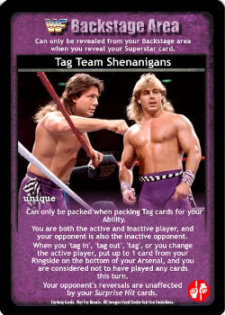 Can only be packed when packing Tag cards for your Ability. You are both the active and inactive player, your opponent is also the inactive opponent. When you 'tag in', 'tag out', 'tag', or you change the active player, put up to 1 card from your Ringside on the bottom of your Arsenal, and you are considered not to have played any cards this turn. Your opponent's reversals are unaffected by your Surprise Hit cards.