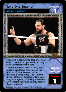 This card is considered blank for your effects, and your opponent can only play 1 reversal to this card. Choose 1 option: draw 1 card, put 1 random card from Ringside on the bottom of your Arsenal, or your opponent discards 1 card; when The 'On One' Arena, Ontario, California is in your Ring or Ringside, or during the Adam Crites Memorial Tournament, double the numbers in this effect.