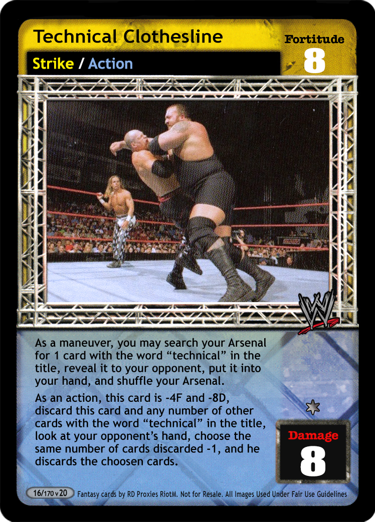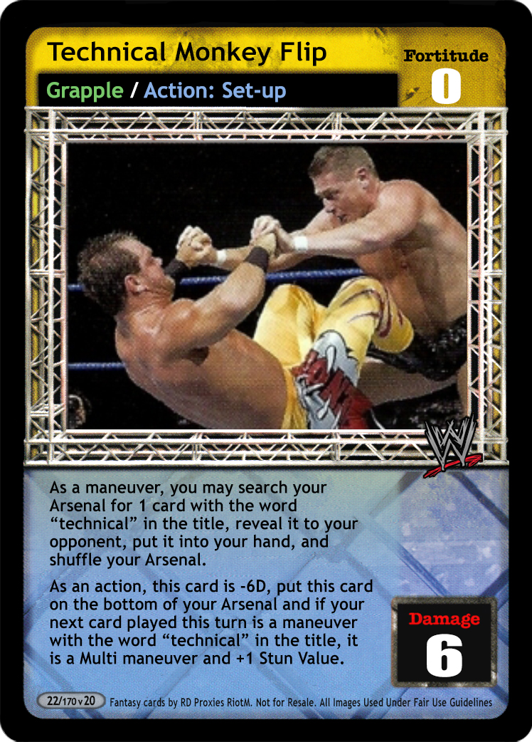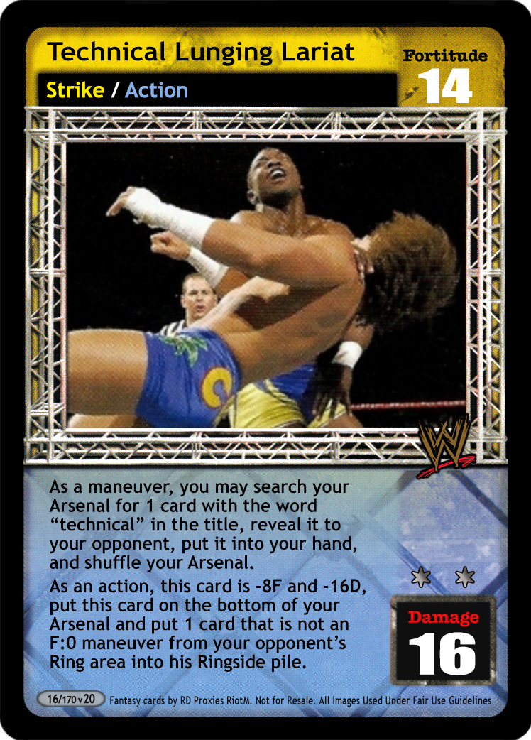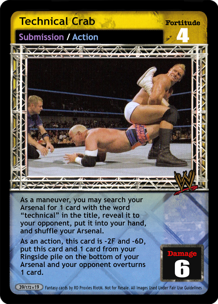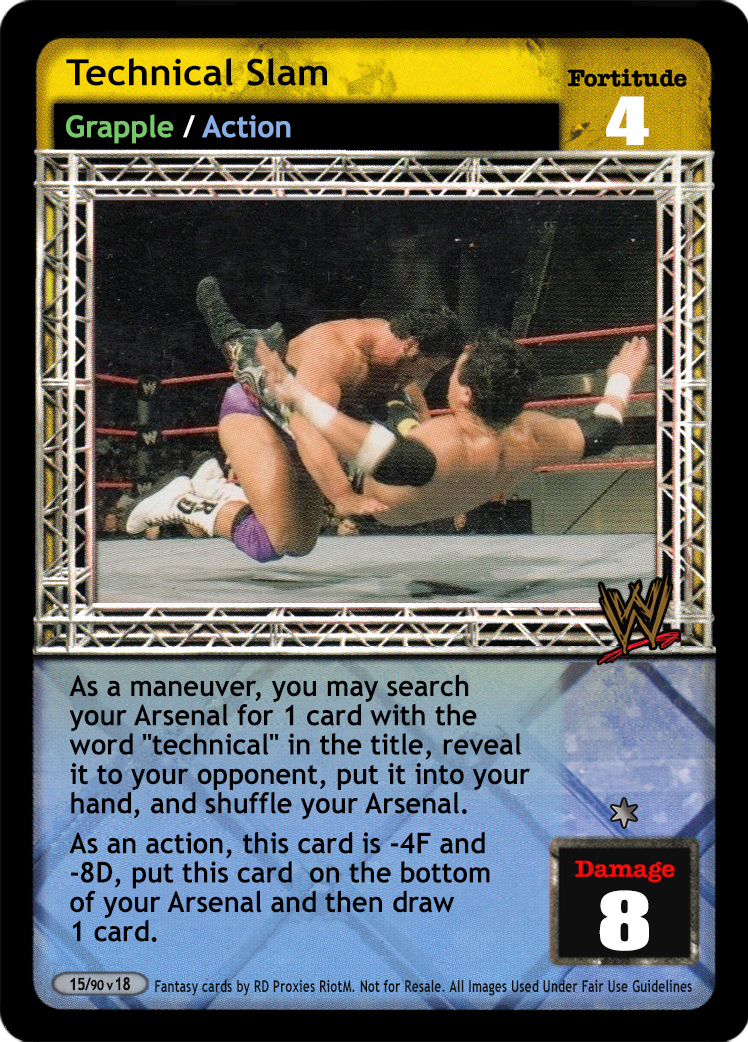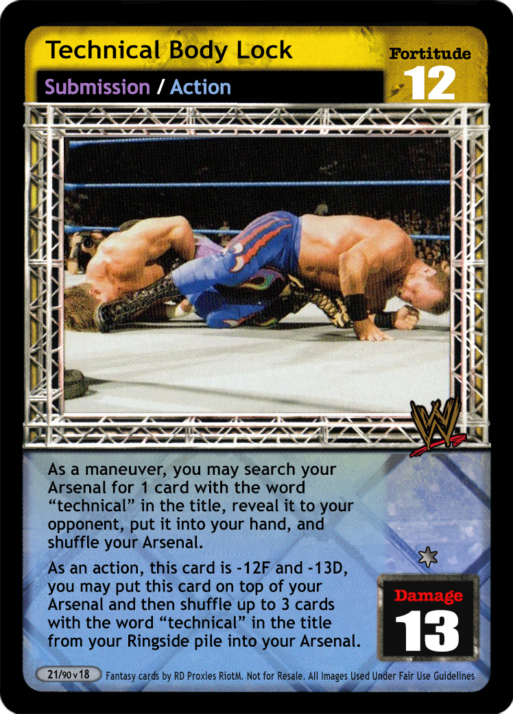 As a maneuver, you may search your Arsenal for 1 card with the word "technical" in the title, reveal it to your opponent, put it into your hand, and shuffle your Arsenal. As an action, this card is -2F and -6D, put this card and 1 card from your Ringside pile on the bottom of your Arsenal and your opponent overturns 1 card.