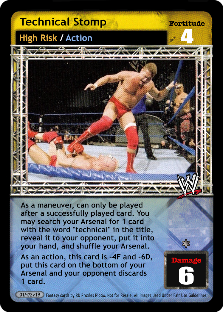 As a maneuver, can only be played after a successfully played card. You may search your Arsenal for 1 card with the word "technical" in the title, reveal it to your opponent, put it into your hand, and shuffle your Arsenal. As an action, this card is -4F and -6D, put this card on the bottom of your Arsenal and your opponent discards 1 card.