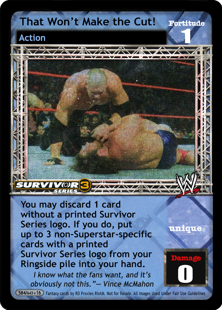 You must discard 1 card without a printed Survivor Series logo and then put up to 3 non-Superstar-specific cards with a printed Survivor Series logo from your Ringside pile into your hand.