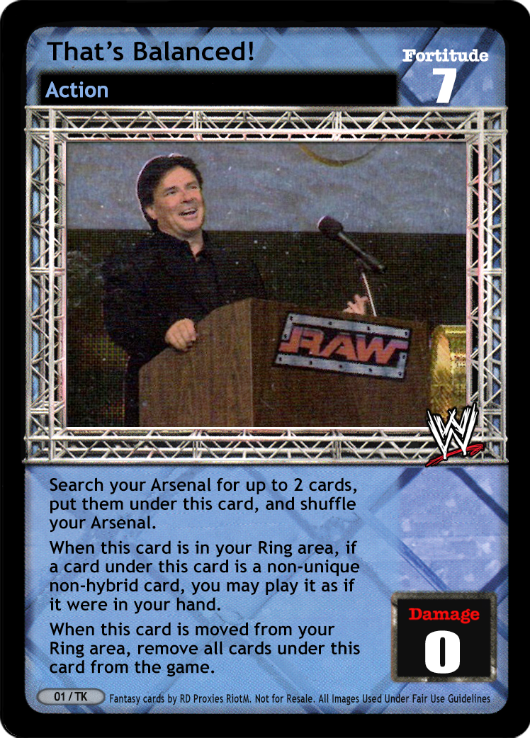Cannot be reversed when played by Mankind or The Mystery Wrestler. Discard 1 Reversal card and then search your Arsenal for 1 non-unique Action card and 1 non-unique Maneuver card, reveal them to your opponent, put them into your hand, and shuffle your Arsenal.