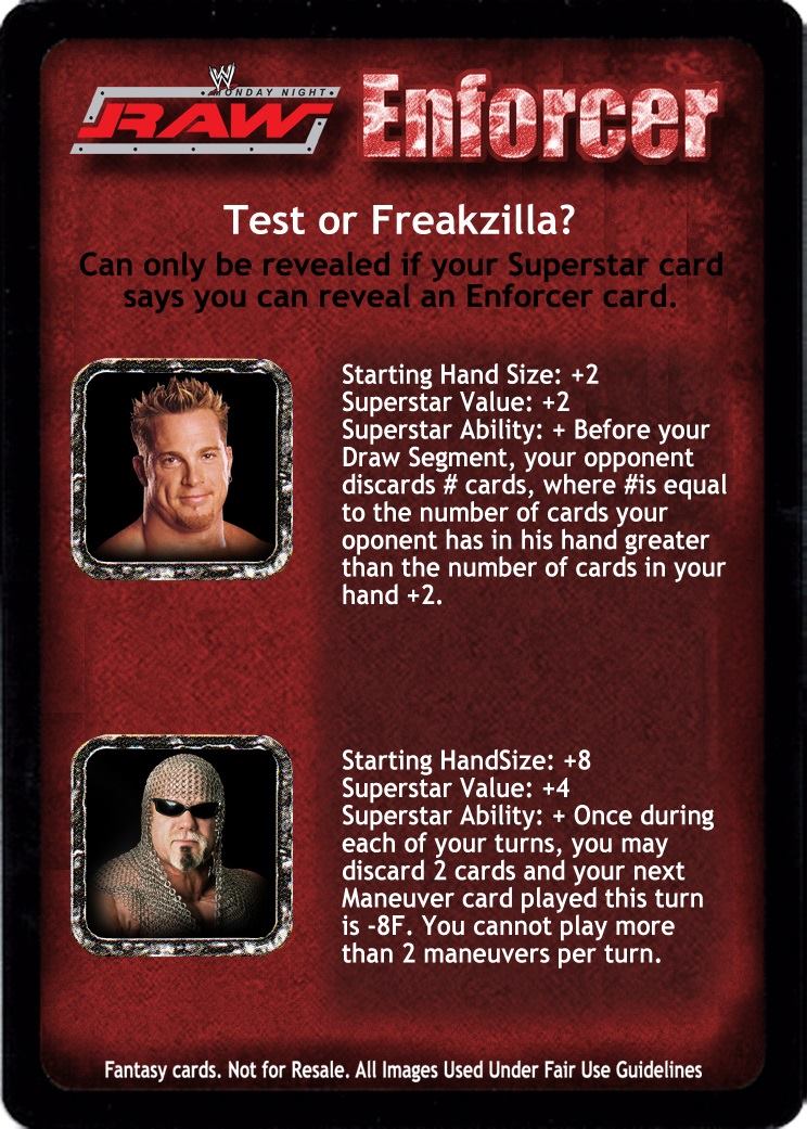 Can only be revealed if your Superstar card says you can reveal an Enforcer card. When this card is revealed by Stacy Keibler, the maximum number of Pre-match cards you may have in your Ring area is reduced by 1. - Starting Hand Size: +2 Superstar Value: +2 Superstar Ability: + Before your Draw Segment, your opponent discards # cards, where # is equal to the number of cards your opponent has in his hand greater than the number of cards in your hand +2. - Starting Hand Size: +8 Superstar Value: +4 Superstar Ability: + Once during each of your turns, you may discard 2 cards and your next Maneuver card played this turn is -8F. You cannot play more than 2 maneuvers per turn.