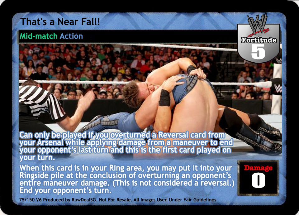 Can only be played if you overturned a Reversal card from your Arsenal while applying damage from a maneuver to end your opponent's last turn and this is the first card played on your turn. When this card is in your Ring area, you may put it into your Ringside pile at the conclusion of overturning an opponent's entire maneuver damage. (This is not considered a reversal.) End your opponent's turn.